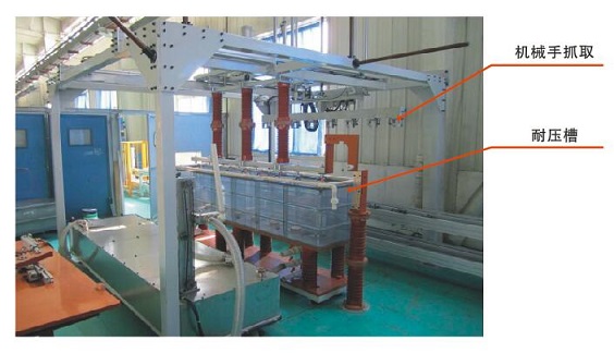 根據(jù)工藝要求,也可以在絕緣油介質(zhì)溶液中進行高壓檢測。系統(tǒng)在識別產(chǎn)品到位后自動抓取并放置在檢測槽內(nèi),根據(jù)產(chǎn)品型號參數(shù)泵入油介質(zhì),按設(shè)定的高壓檢測工藝自動完成升壓、保持、降壓工作過程。